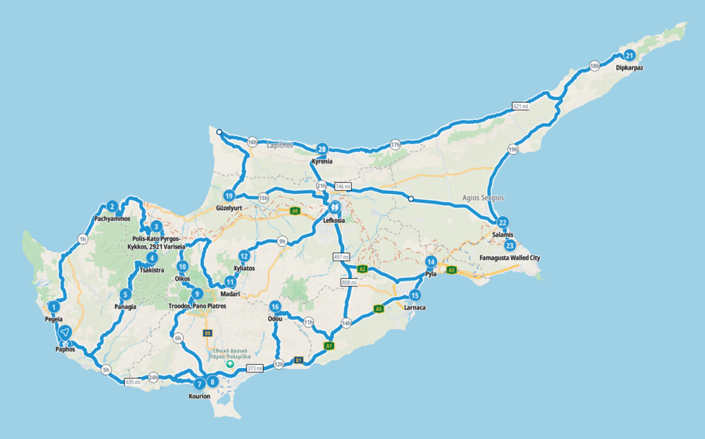 The route takes us from Paphos – Pegeia – Pachyammos – Tsakistra – Panagia – Paphos – Kourion – Kolossi – Troodos – Oikos – Madari – Xyliatos – Lefkosia – Pyla – Larnaca – Odou – Paphos – Nicosia – Güzelyurt – Kyrenia – Dipkarpaz – Salamis – Famagusta – Nicosia – Kyrenia – Paphos